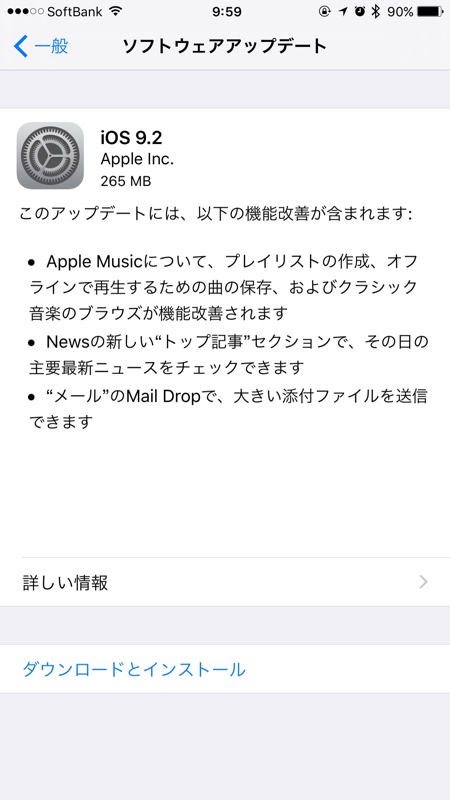 本日、午前中に開いたところ、IOS9.2が通知が来ていた。
